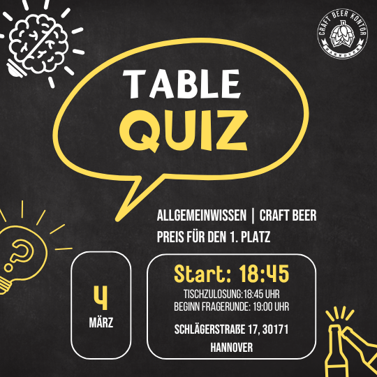 Bereitet euch auf einen spannenden Abend voller Rätsel und Allgemeinwissen vor! Unser Table Quiz findet in Form von drei Runden mit jeweils 10 Fragen statt. Die Teams werden zufällig an 4er Tischen zusammengestellt, wodurch jeder die Chance hat, neue Leute kennenzulernen.